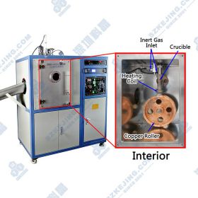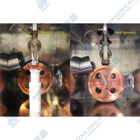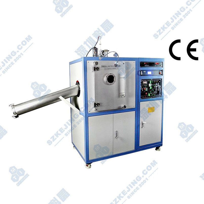 VTC-500是一款實驗型高真空金屬甩帶爐,用于制備非晶態(tài)金屬材料。在該工藝中,金屬錠(<50g)通過感應加熱的方式進行熔化,之后利用氣流進行推動,通過坩堝底部細孔或扁口形成細流滴落到快速旋轉(zhuǎn)的冷銅輥表面,從而達到快速淬火的效果,得到非晶態(tài)金屬帶片。