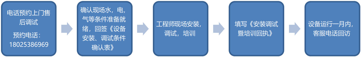 2)工程師上門安裝前需要確認(rèn)現(xiàn)場條件,確認(rèn)現(xiàn)場水,電,氣等條件就緒后安排上門,請配合回簽《設(shè)備安裝、調(diào)試條件確認(rèn)表》