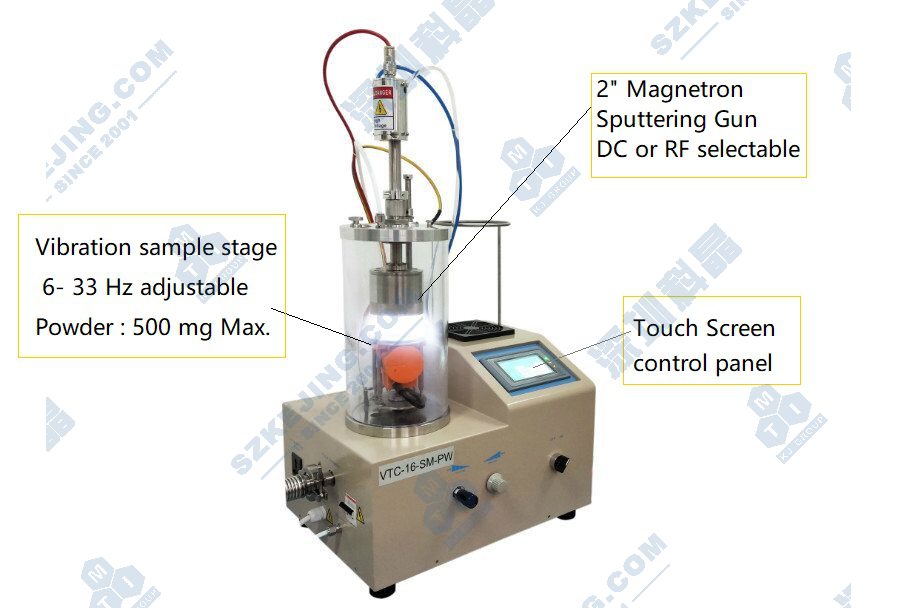 VTC-16-PW是一款小型粉末包覆系統(tǒng),主要有2英寸磁控濺射頭和振動(dòng)樣品臺(tái)組成。粉末在振動(dòng)樣品臺(tái)上振動(dòng)翻滾,通過(guò)濺射在粉末表面進(jìn)行包覆形成核殼結(jié)構(gòu)。直流磁控濺射適合粉體表面包覆金屬材料.射頻磁控濺射適合材料表面包覆非金屬材料或碳。