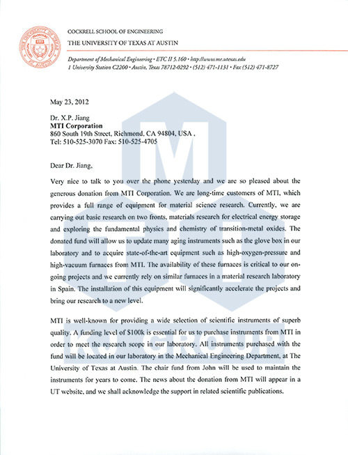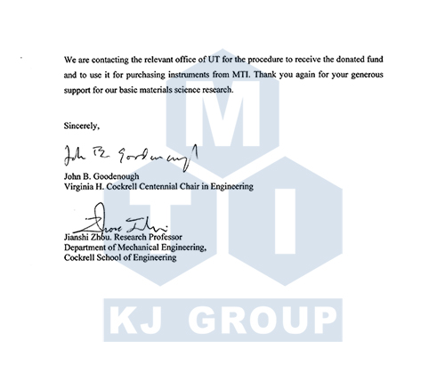 材料研究是一項非常辛苦的工作,每個獲獎者背后都有一批默默的工作團隊,每天夜以繼日,踏踏實實做著無窮多反反復復的實驗。MTI的創(chuàng)始人江曉平博士當年做小型材料實驗室設備的想法正是得益于John B. Goodenough老先生的啟發(fā)。老先生一直也是江曉平博士最敬仰的教授之一,在得知老先生長期以來一直堅持在研發(fā)第一線,但實驗室設備很陳舊時,深有感觸。于是在2012年捐了一套實驗室鋰電池研發(fā)設備給他,幫他改善實驗條件,為此老先生還親自回信給江曉平博士,江曉平博士將這封信一直珍藏至今。