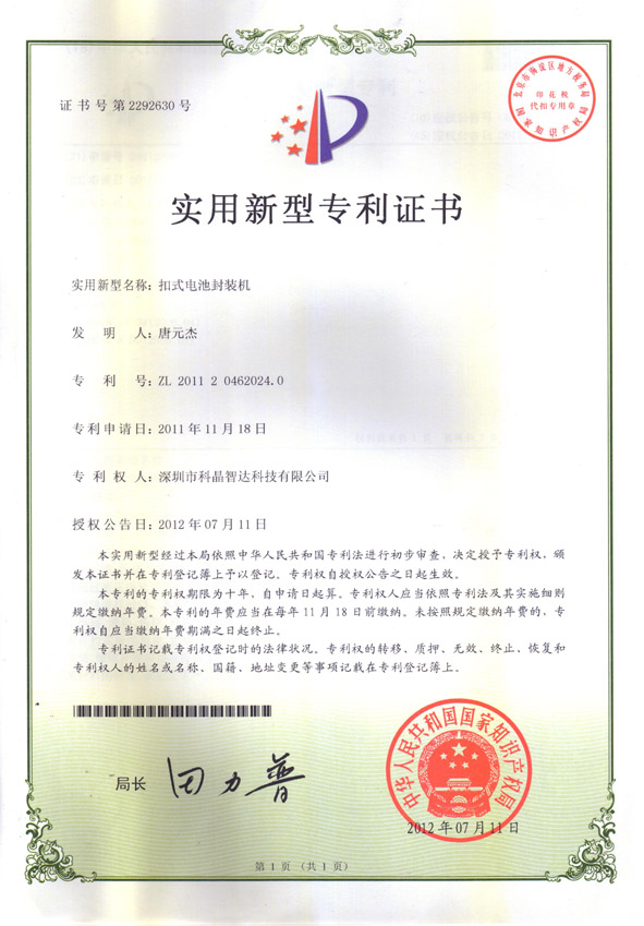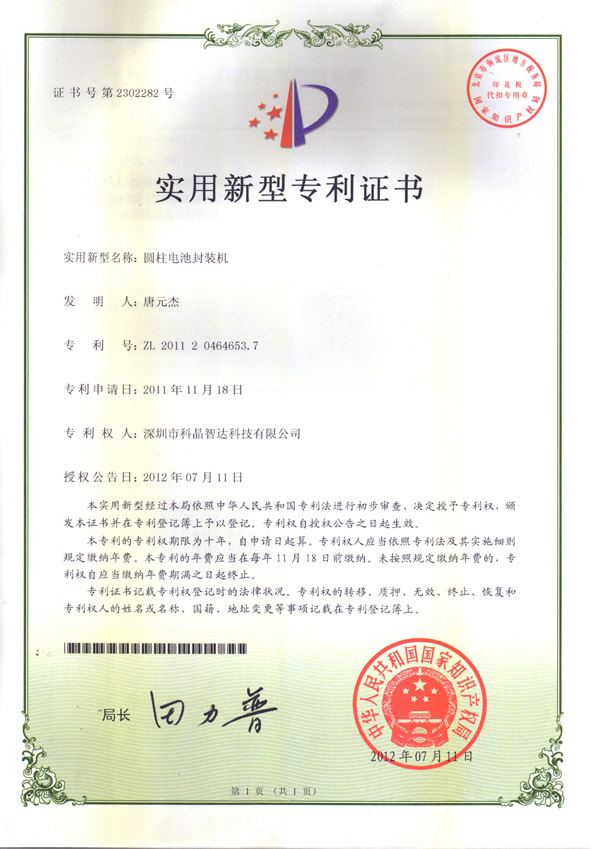 • 科晶集團-深圳科晶電池研發(fā)系列設(shè)備榮獲國家知識產(chǎn)權(quán)實用新型設(shè)計專利