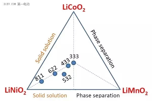 )三元材料。通過調(diào)配鎳、鈷、錳三者的比例,得到不同的電極特性。
