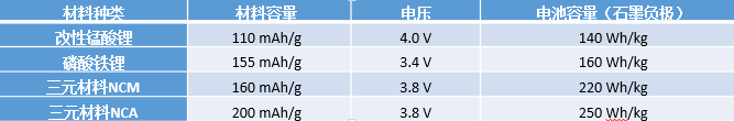 三元材料對比鋰電池,到底有什么優(yōu)勢。從下表看看各種正極材料的能量密度參數(shù)。