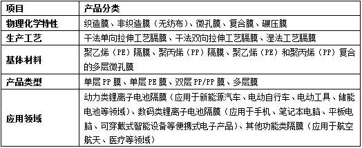表1 隔膜產(chǎn)品分類