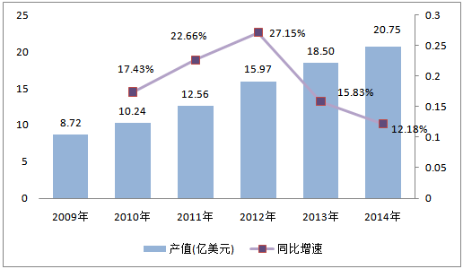 圖5 2009-2014年全球隔膜產(chǎn)值:億美元