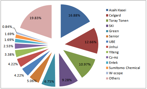 圖6 2014年全球隔膜產(chǎn)業(yè)主要企業(yè)市場占有率(按出貨量)