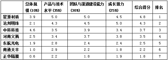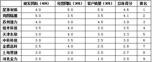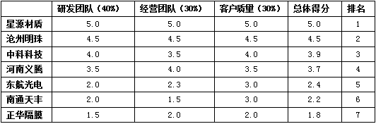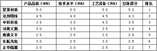 星源材質(zhì)以綜合得分4.8分排名第一,滄州明珠以綜合得分4.3分排名第二,中科科技以綜合得分3.7分排名第三。后續(xù)企業(yè)排名依次為河南義騰、東航光電、南通天豐和正華隔膜。