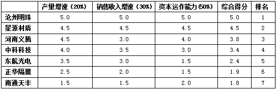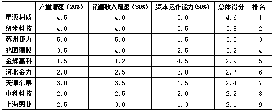 在企業(yè)成長潛力的判斷中,賽迪顧問依然選取了產(chǎn)量增速、銷售收入增速和資本運作能力三個指標(biāo)作為判斷隔膜企業(yè)成長潛力的基礎(chǔ)指標(biāo),并分別賦予20%、30%和50%的權(quán)重。最終的評價結(jié)果如下表所示: