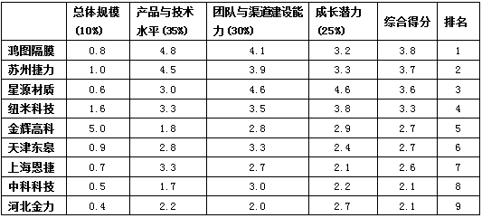 通過對總體規(guī)模、產(chǎn)品與技術(shù)、團隊與渠道建設(shè)能力、成長潛力四個維度的綜合評價。賽迪顧問梳理出濕法隔膜領(lǐng)域競爭力綜合排名如下: