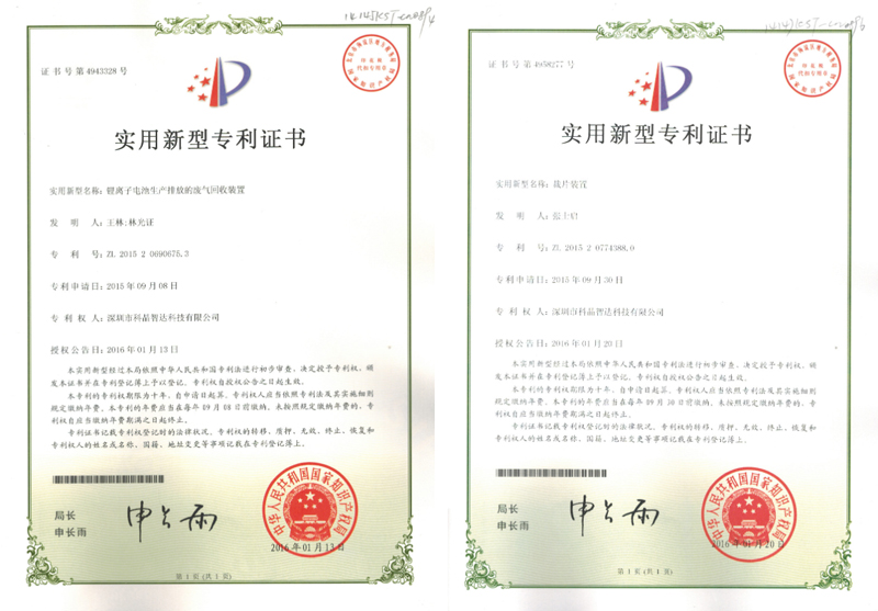 2015年9月8日和9月30日,深圳市科晶智達(dá)科技有限公司提出鋰離子電池生產(chǎn)排放的廢棄回收裝置和載片裝置兩項專利的申請,專利號分別為ZL 2015 2 0690675.3和ZL 2015 2 0774388.0,兩項專利成功授權(quán)公告時間分別為2016年1月13日和2016年1月20日。深圳科晶堅持創(chuàng)新發(fā)展理念,不斷探討新型實用裝置,在改善自身條件的同時,不斷為客戶提供更優(yōu)質(zhì)的產(chǎn)品和服務(wù)!