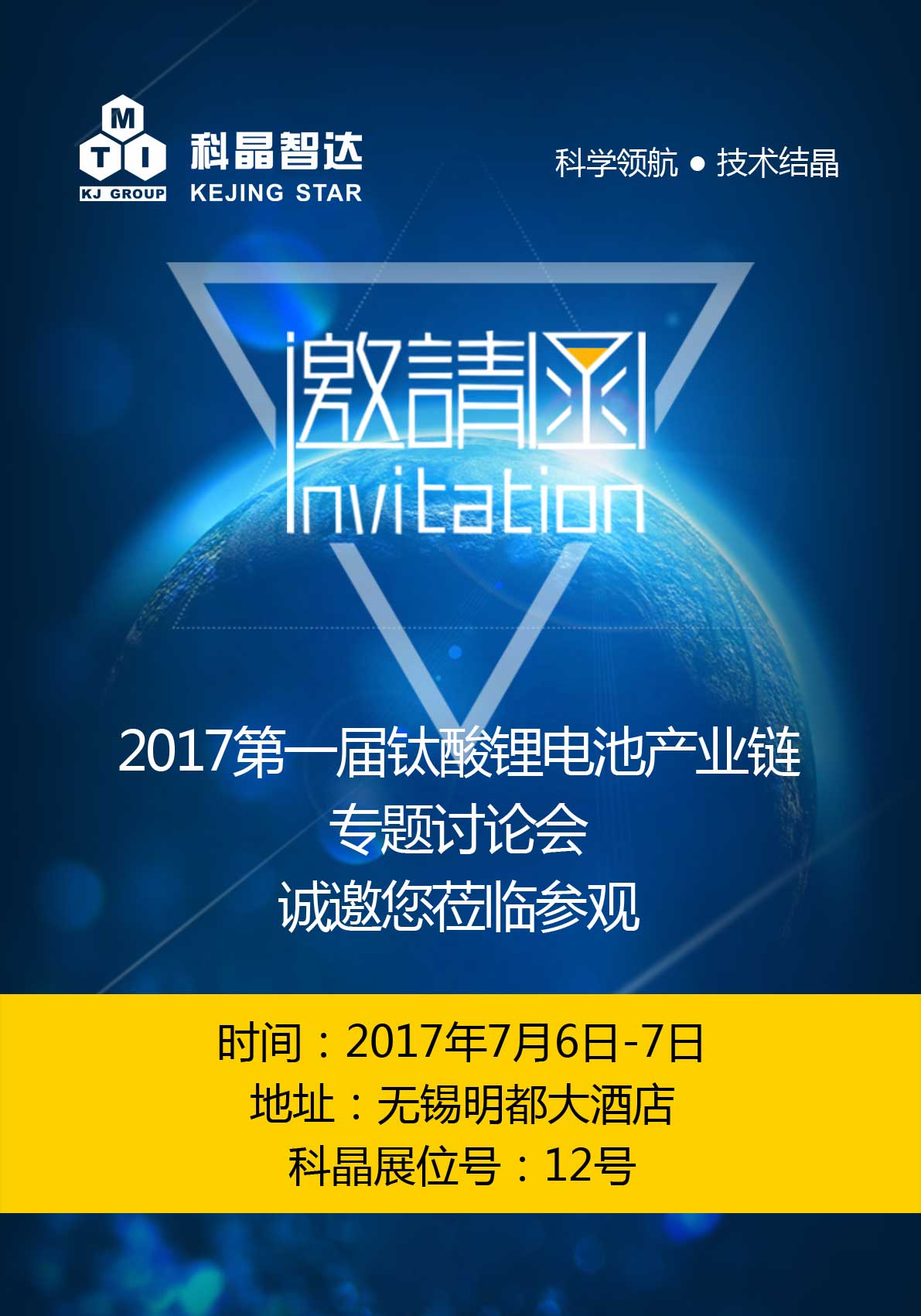 深圳科晶將于2017年7月6日-7日在無(wú)錫明都大酒店參加2017第一屆鈦酸鋰電池產(chǎn)業(yè)鏈專題討論會(huì),展位號(hào):12號(hào),歡迎有興趣的客戶前來(lái)了解、咨詢!