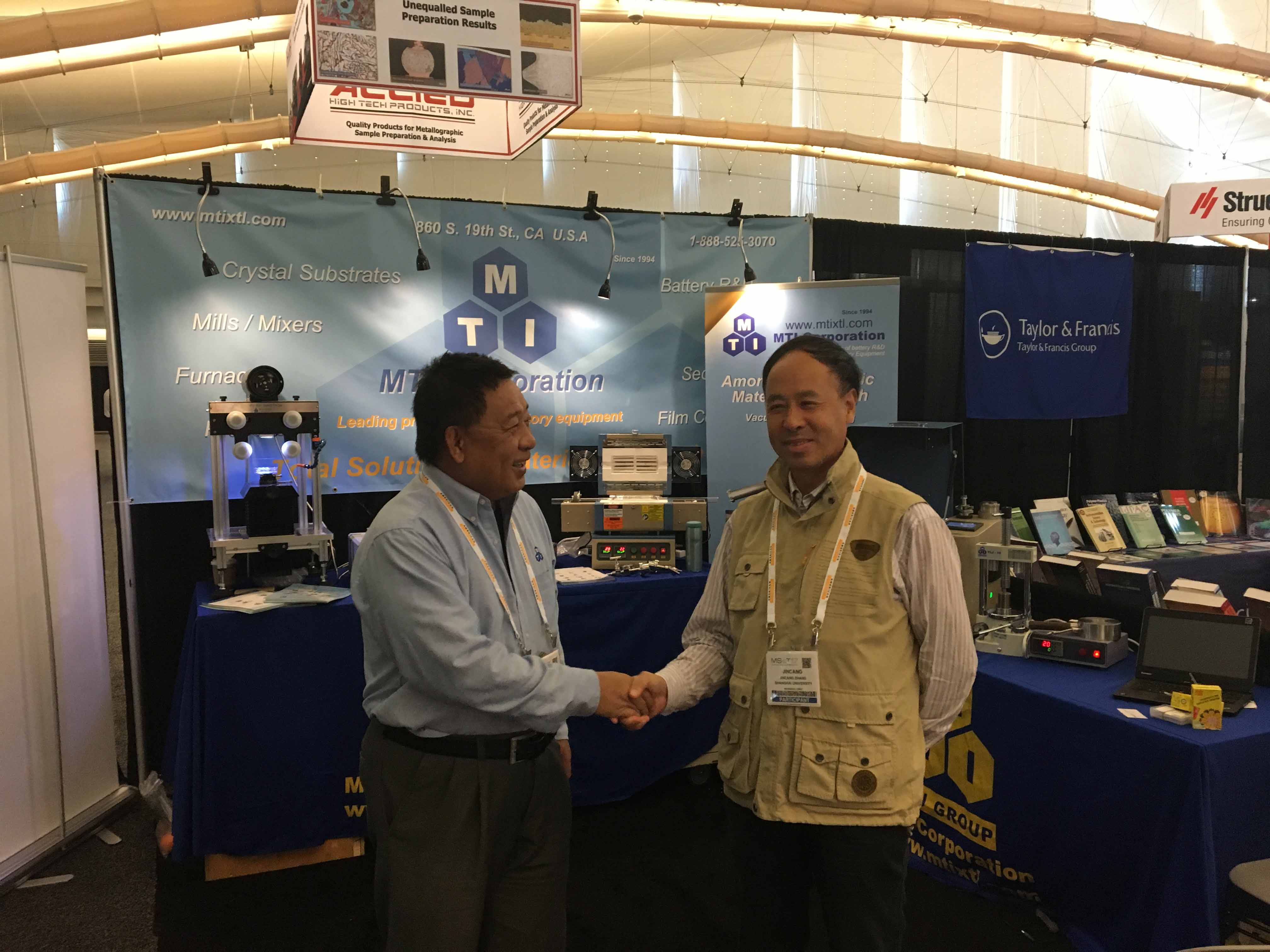 會議上,上海大學(xué)的張金昌院長,金屬所楊院生教授,以及各個院校研究機(jī)構(gòu)的教授和博士到訪了MTI展臺。江博士還參加了武漢理工大學(xué)團(tuán)隊在匹茲堡的晚宴,和張清杰校長,材料學(xué)院劉韓星院長有了非常好的互動。張校長和劉院長都邀請江博士明年訪問武漢理工。