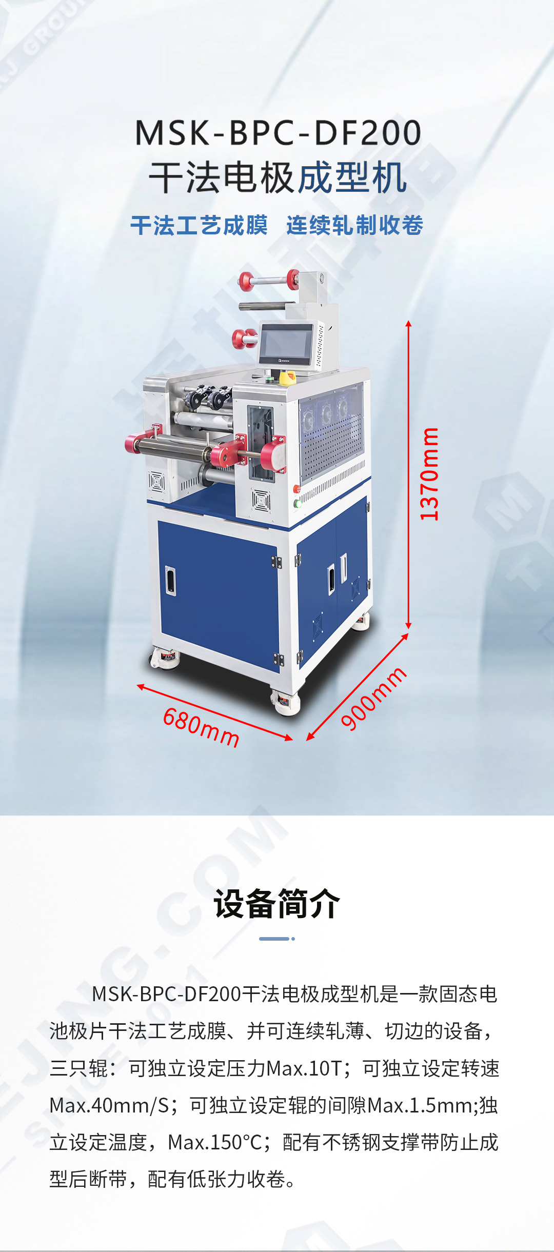 應用范圍:MSK-BPC-DF200 干法電極成型機是一款電池材料干法工藝成膜、并可連續(xù)軋薄、切邊的設備,三只輥:可獨立設定壓力Max.10T;可獨立設定速度Max.16mm/S;可獨立設定輥的間隙Max.1.2mm;獨立設定溫度,Max.150℃;配有不銹鋼支撐帶輔助成膜后低張力收卷。(如果需要做固態(tài)電解質,請選擇MSK-BPC-DF200-W-B)